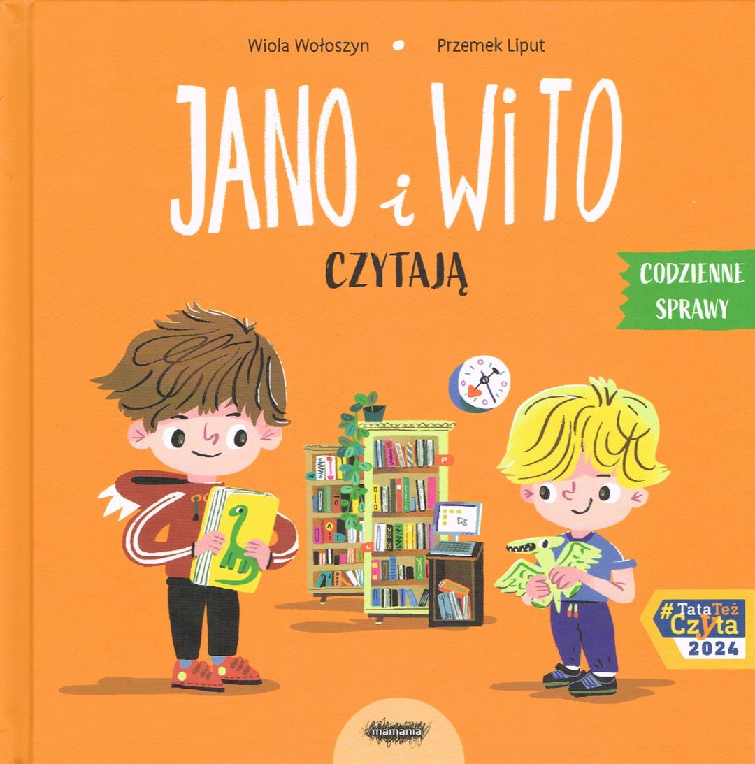 Jano i Wito czytają / [tekst:] Wiola Wołoszyn , [ilustracje:] Przemek Liput. - Warszawa : Mamania, copyright 2024. - [22] strony : ilustracje ; 20x20 cm.